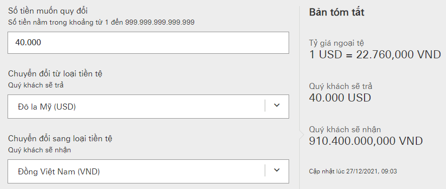 Kết quả quy đổi: 40.000 USD = 908.400.000 VND