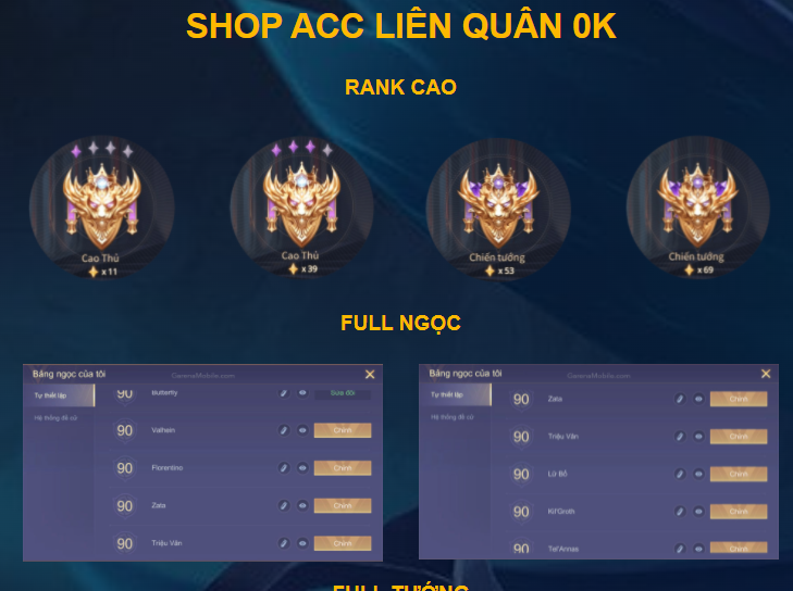Game thủ muốn có acc top đầy đủ tướng, skin xịn và full ngọc để chiến thì có thể liên hệ các shop thẻ cào garena hoặc các diễn đàn cộng đồng game Liên Quân để liên hệ nhận acc miễn phí. phí.